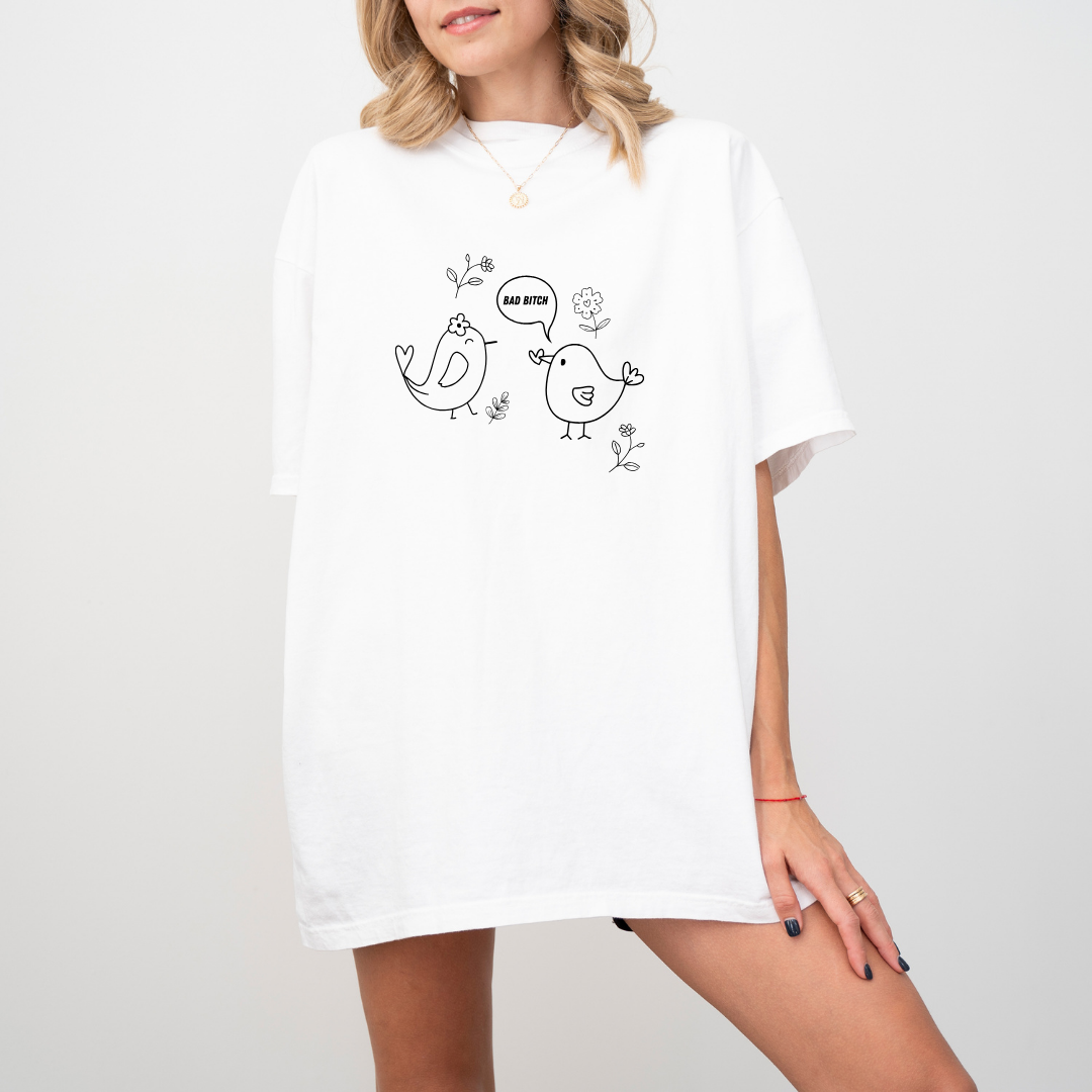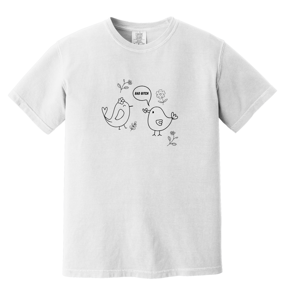 WHITE T SHIRT WITH BIRDS SCREEN PRINT IN BLACK