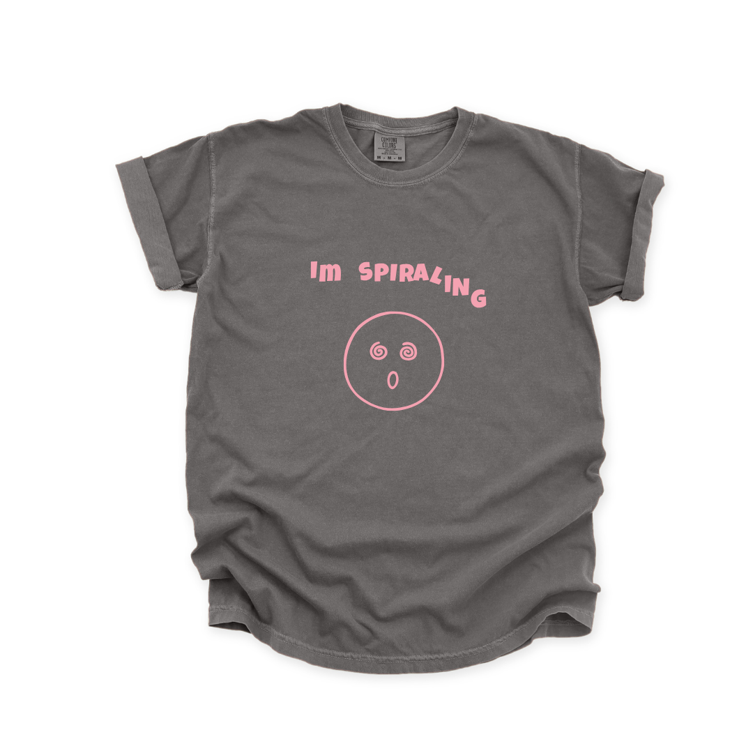 GRAY T SHIRT WITH "I'M SPIRALING" PRINT IN PINK