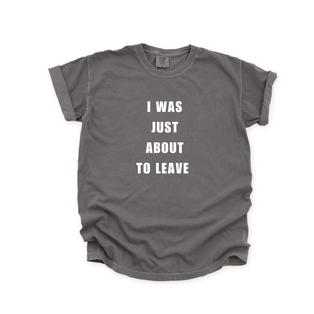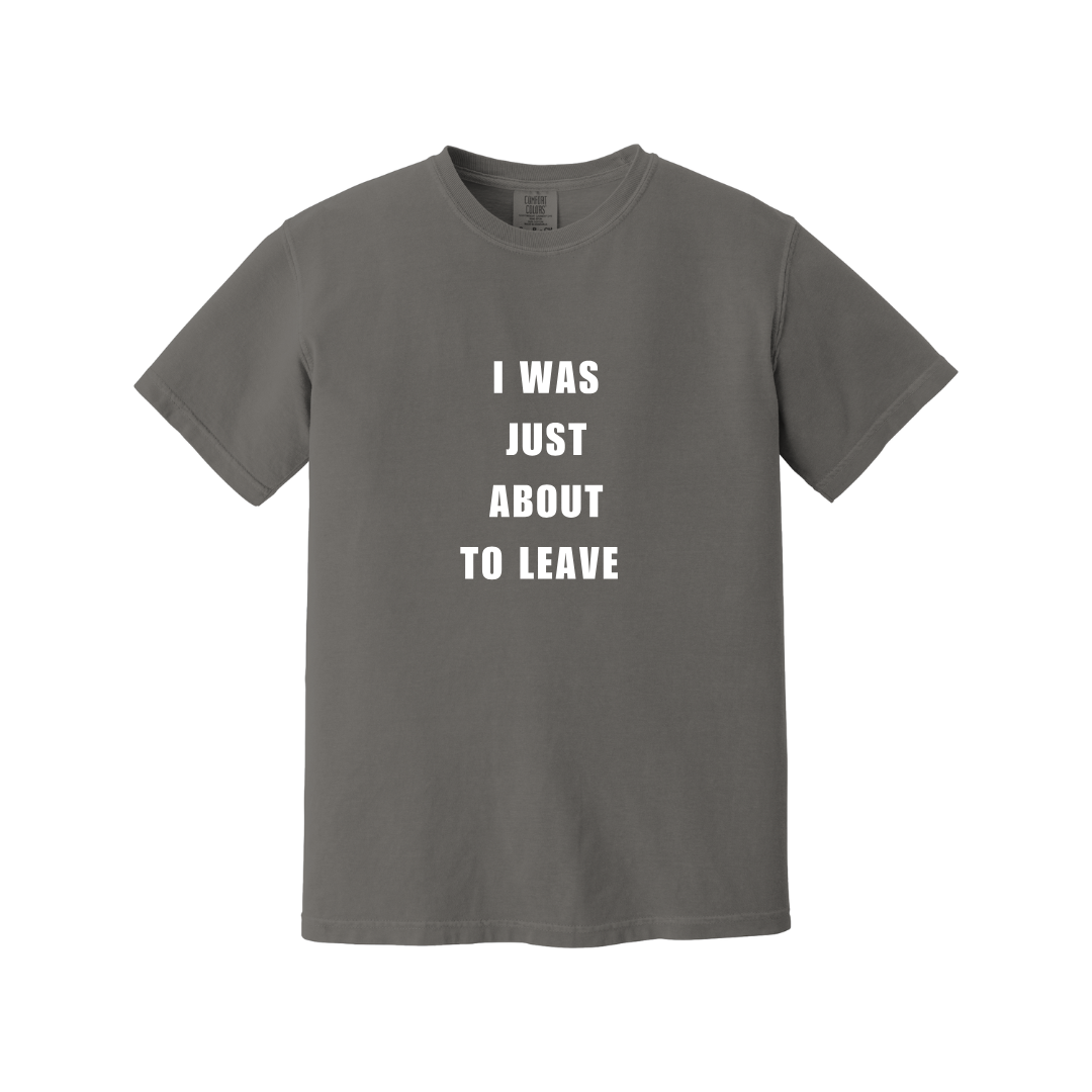 GRAY T SHIRT WITH "I WAS JUST ABOUT TO LEAVE" SCREEN PRINT IN WHITE